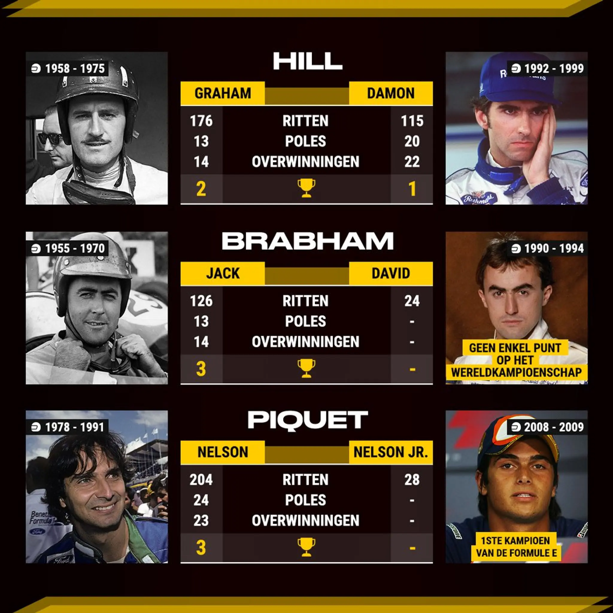 Er bestaat echt geen gen voor wereldkampioenen! David Brabham en Nelson Piquet Junior bewijzen dat. Het optreden in de koningsklasse was voor beide coureurs van korte duur. Piquet reed 28 races met Renault en Brabham behaalde slechts 24 Grand Prix-races. De Australiër slaagde er geen enkele keer in om punten te sprokkelen op een wereldkampioenschap en ook de Braziliaan kon maar 7 punten verzamelen in zijn carrière. In 2015 won de 30-jarige wel de Formule E, die toen voor het eerst plaatsvond. Hun vaders van hun kant kunnen er prat op gaan dat ze drie keer tot wereldkampioen werden gekroond.
