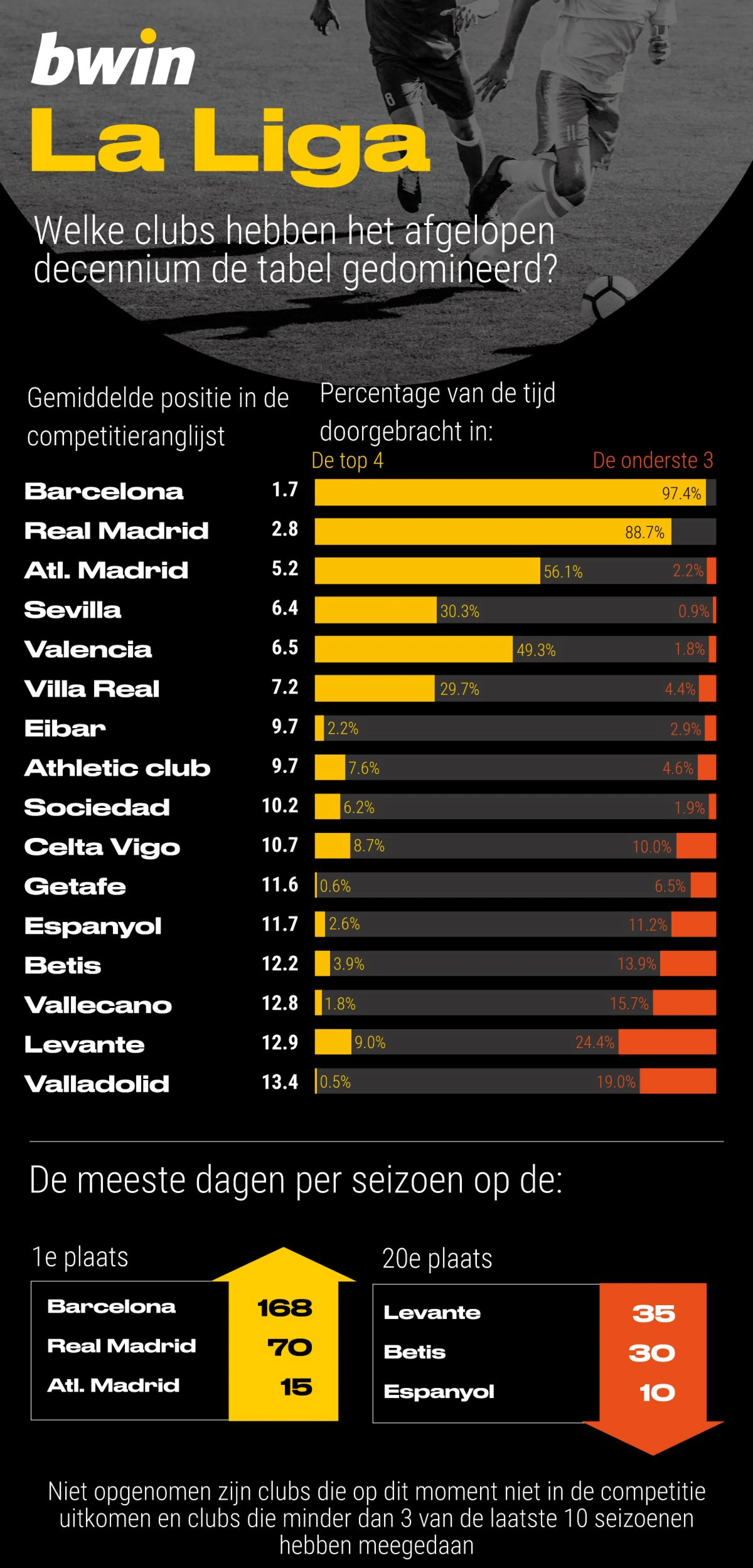 Al lijkt de Spaanse competitie een strijd tussen ‘de grote twee’, dit gevecht was het afgelopen decennium ietwat eenzijdig. Barcelona heeft 97% van de laatste 10 seizoenen op een Champions League plaats doorgebracht en gemiddeld 168 dagen op de eerste plaats – meer dan Bayern München in Duitsland en PSG in Frankrijk – en laat Real Madrid ver achter zich.