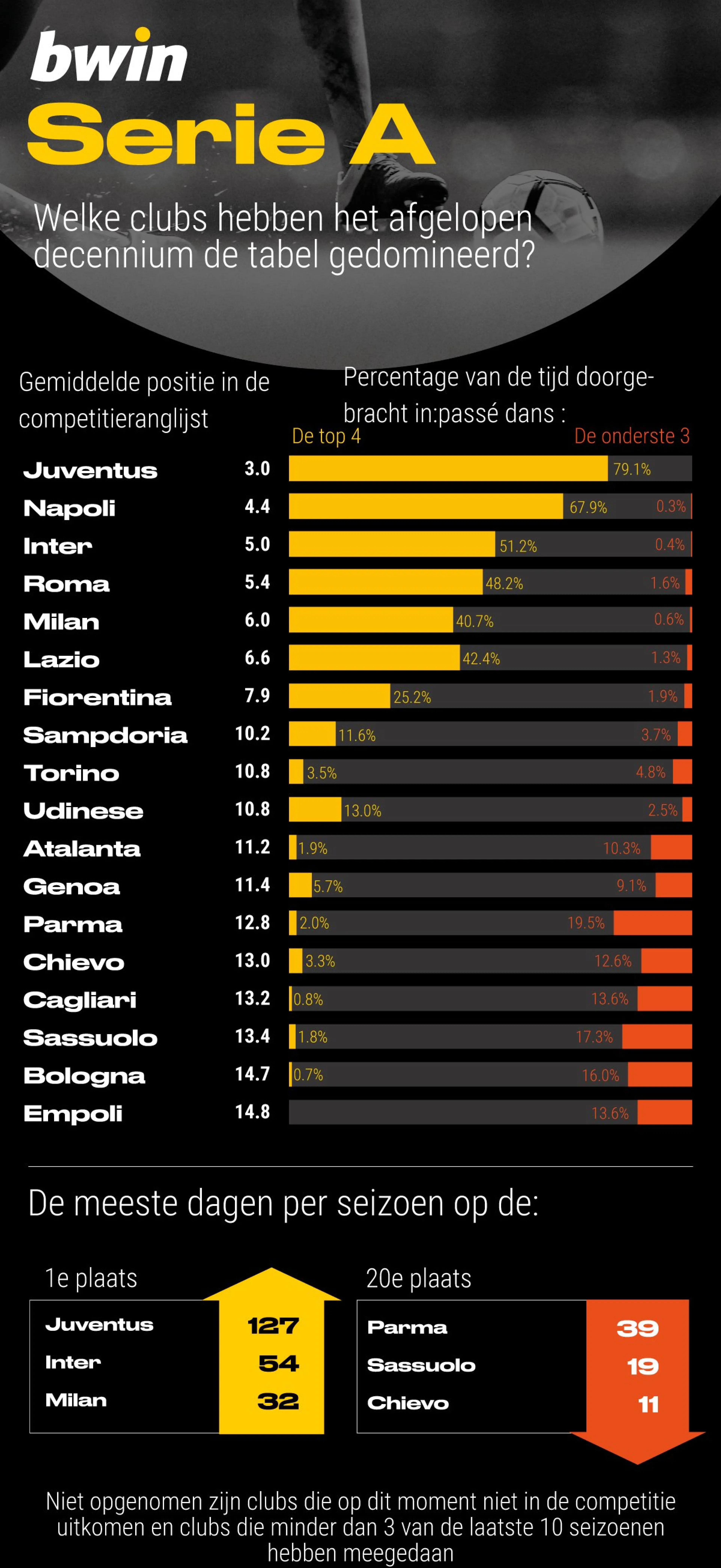 Juventus ‘ overheersing in het Italiaanse voetbal komt duidelijk tot uiting in de statistieken: de club uit Turijn bezette bijna vier op elke vijf dagen een Champions League plaats en voerde ieder seizoen gemiddeld 127 dagen de ranglijst aan.