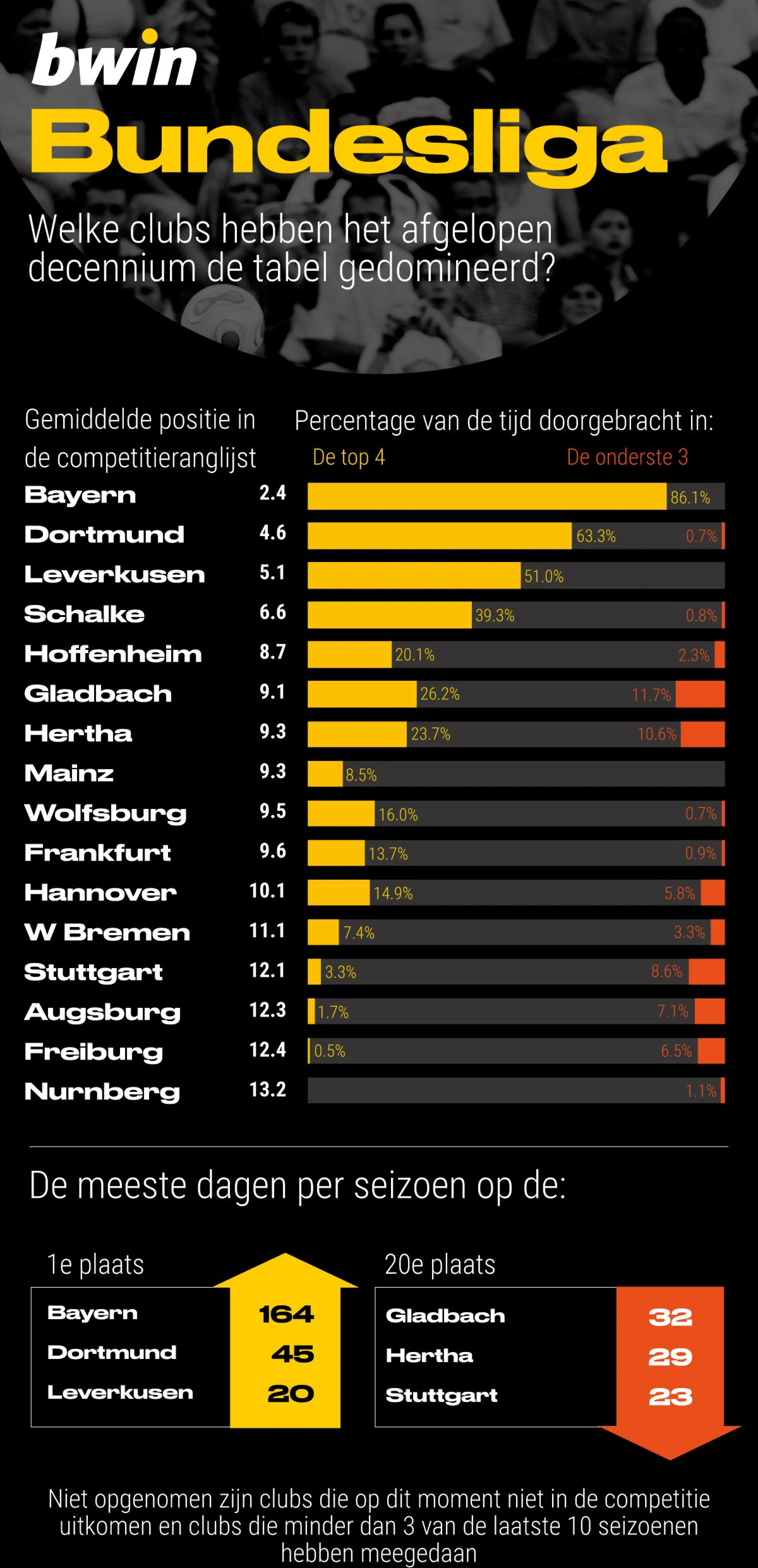 Het zal voor niemand als een verrassing komen dat één team het afgelopen decennium de Duitse topcompetitie heeft gedomineerd. Bayern München stond gemiddeld 164 dagen per seizoen op de bovenste plek – ruimschoots langer dan alle anderen clubs samen – en bracht minder dan twee weken per seizoen buiten de bovenste helft van de ranglijst door.