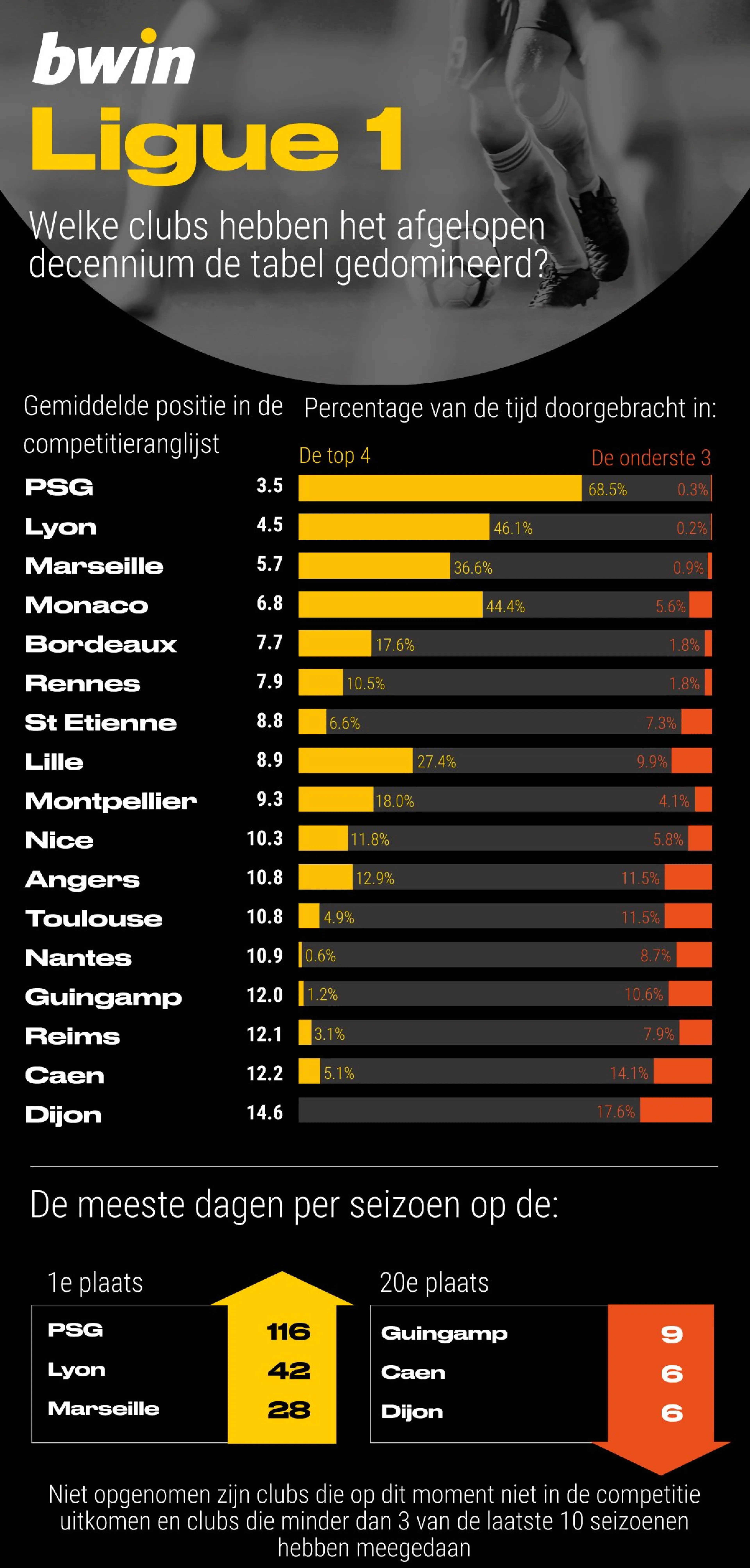 Het zal geen verrassing zijn dat PSG de afgelopen jaren het vaakst bovenaan de Ligue 1 tabel te vinden was.
