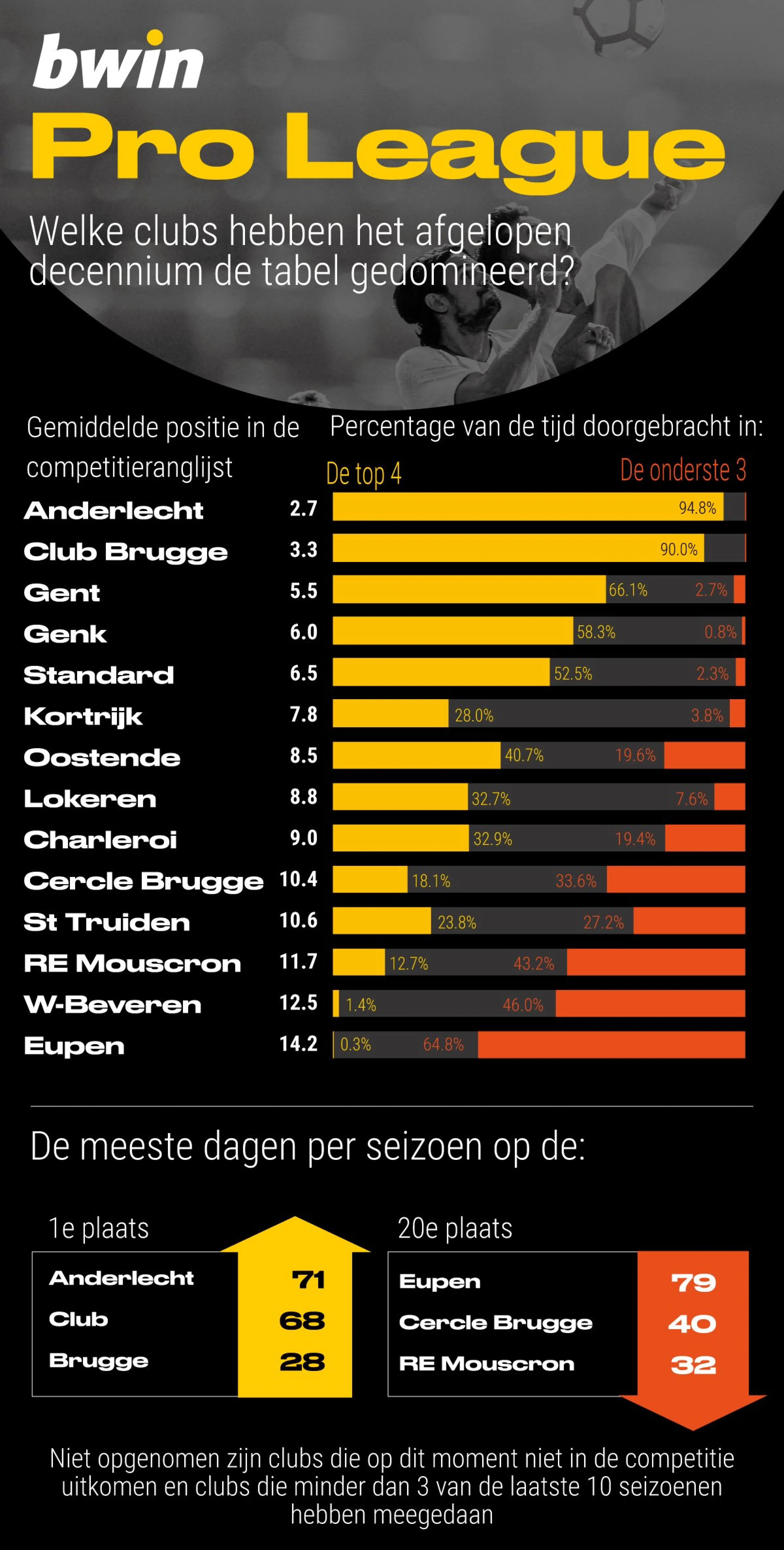 In België splitst de ranglijst in tweeën nadat de teams elkaar twee keer hebben ontmoet, dus we hebben alleen de tabellen tot aan dat moment berekend. Ook hebben we naar de laatste acht jaar gekeken in plaats van de laatste tien, vanwege de wijziging in het aantal deelnemende clubs.