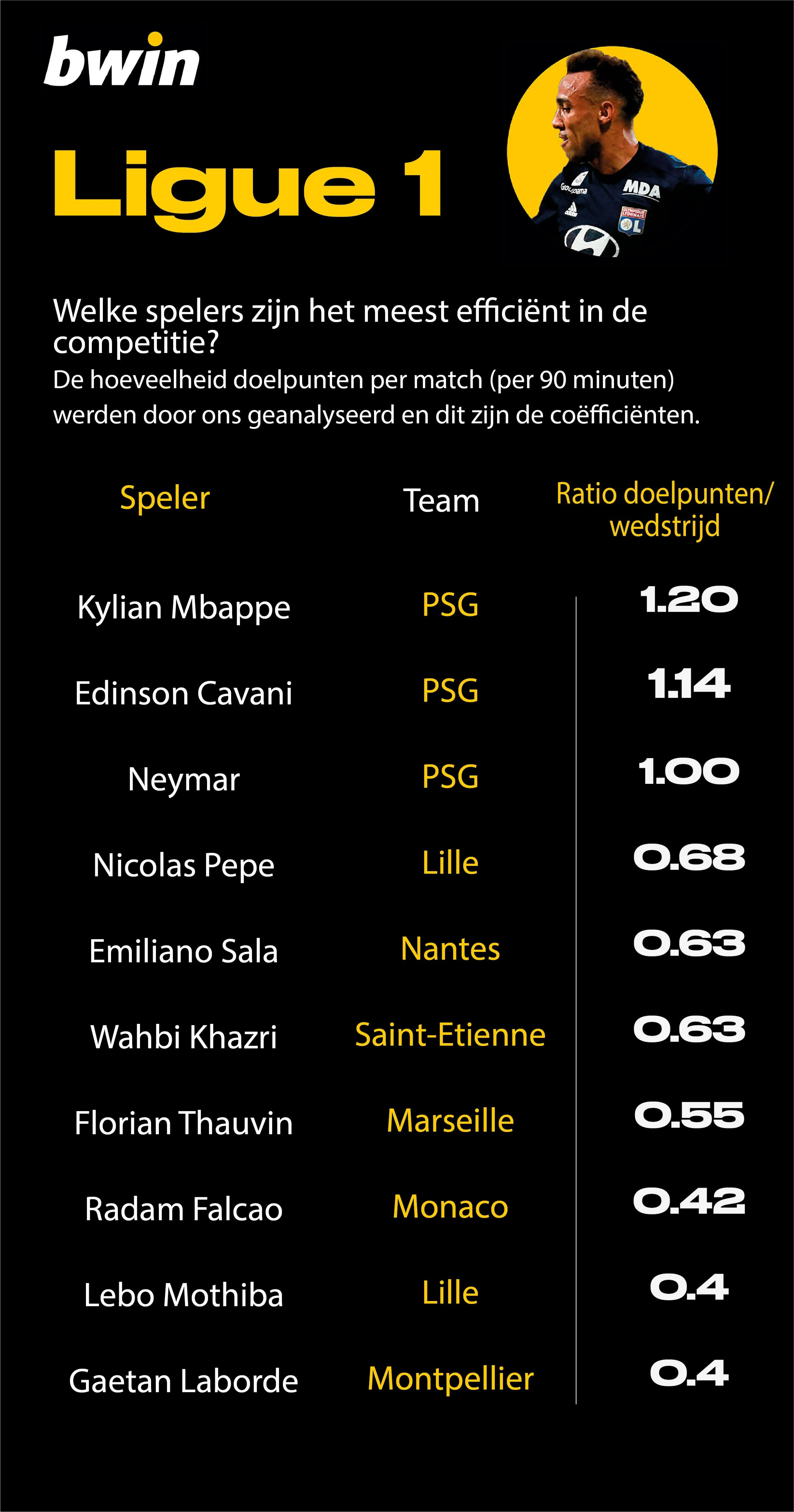Van alle spelers die geanalyseerd werden (in de zes kampioenschappen) is Kylian Mbappe degene die de hoogste score haalt. Hij scoorde gemiddeld 1.20 goals/match (alle competities samen), wat buitengewoon is. Samen met teamgenoot Edinson Cavani (1.14 goals/match) zijn het de twee enige spelers die gemiddeld meer dan één goal per match scoorden.