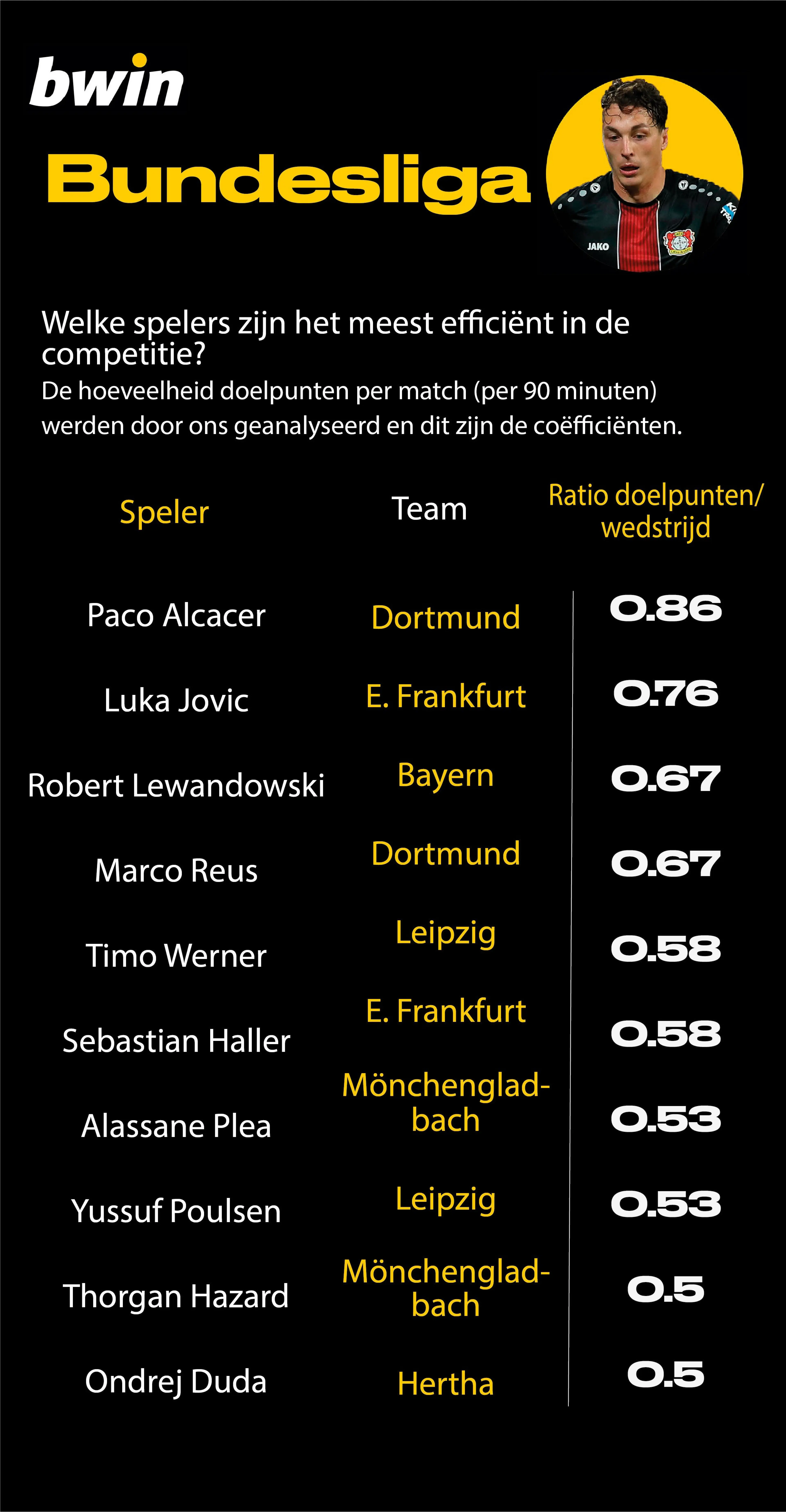 De topschutter van de Duitse competitie is niet degene die het vaakst scoort. Luka Jovic (E. Frankfurt) heeft op dit moment het grootste aantal goals gescoord, maar het is Paco Alcacer (Dortmund) die de beste goals per match verhouding heeft. Het verschil met Luka Jovic is toch wel aanzienlijk want het bedraagt niet minder dan 0.10 goals/match.