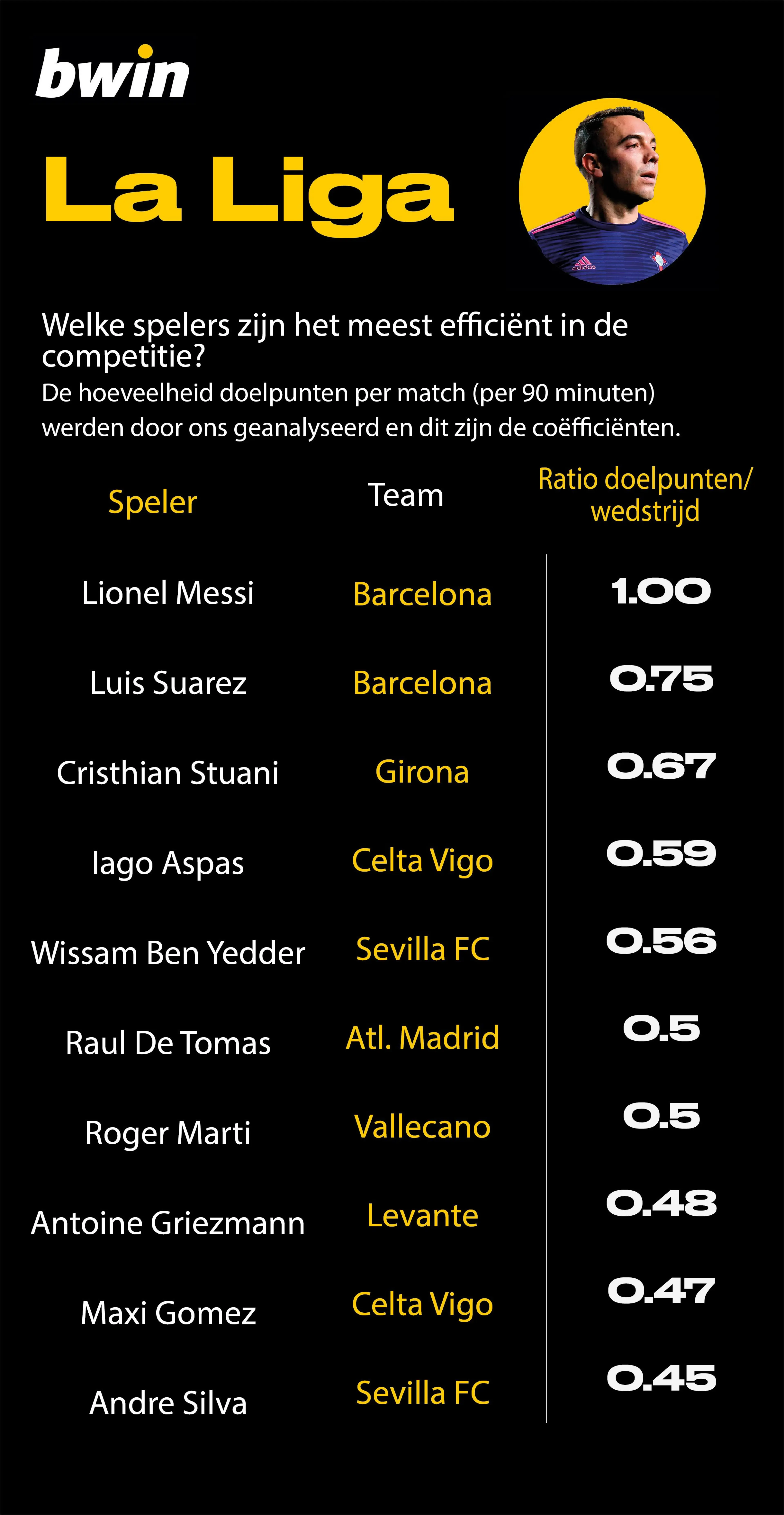 In de Spaanse liga staat Lionel Messi natuurlijk op kop, maar het is vooral zijn score die opmerkelijk is. Het Argentijnse genie scoort gemiddeld 1.00 goals/match, een ongelooflijke prestatie!