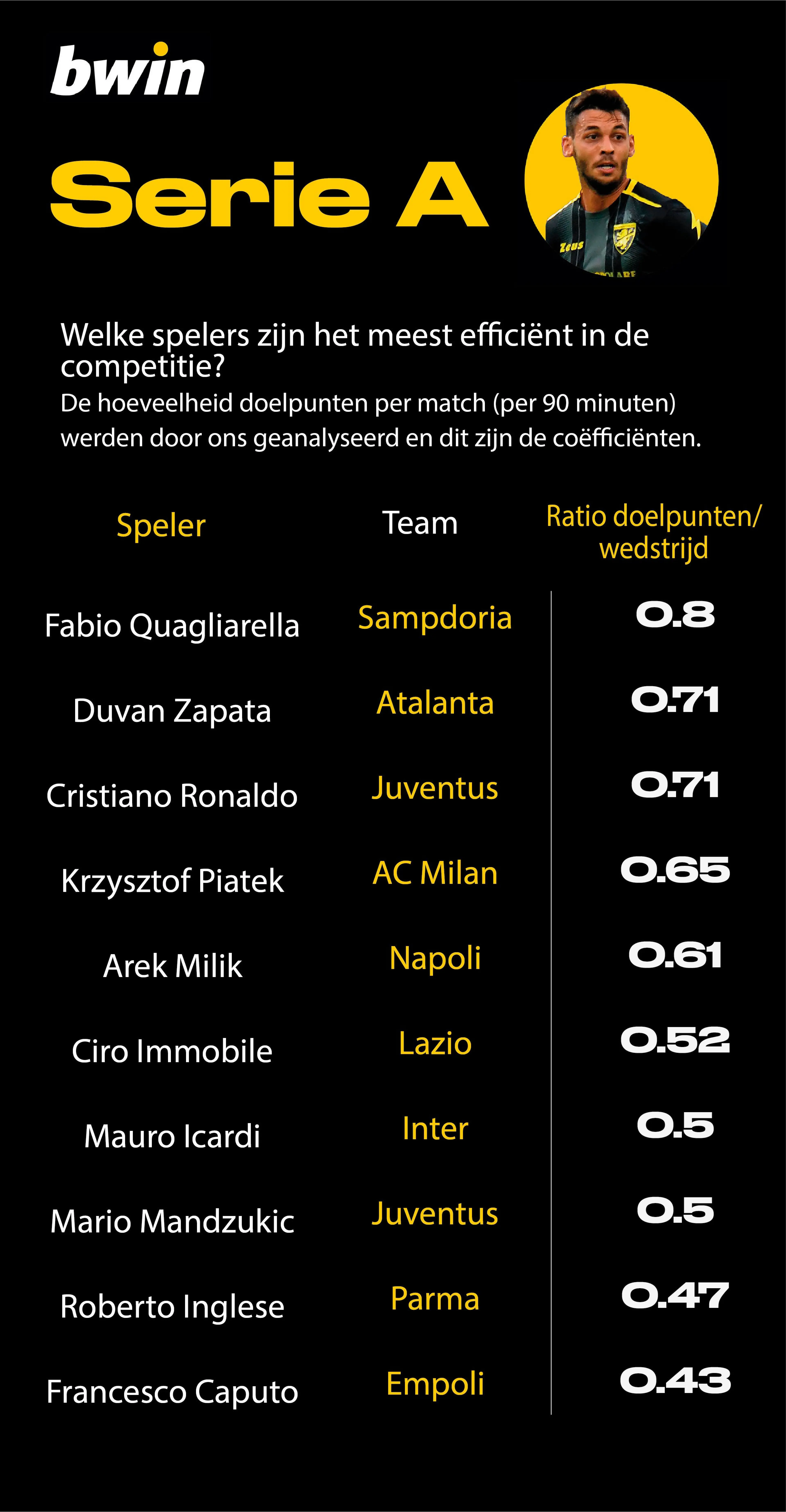 Van alle spelers van de Italiaanse eerste klasse is Fabio Quagliarella (Sampdoria) degene met de beste goals/match verhouding : 0,80. Nochtans is zijn club pas zesde in de stand. Op de tweede plek vinden we twee spelers terug die exact dezelfde score halen : Cristiano Ronado (Juventus) en Duvan Zapata (Atalanta). De Portugese ster doet het bijzonder goed, vooral als we stilstaan bij de tijd die hij nodig heeft gehad om zich aan zijn nieuwe omgeving aan te passen.