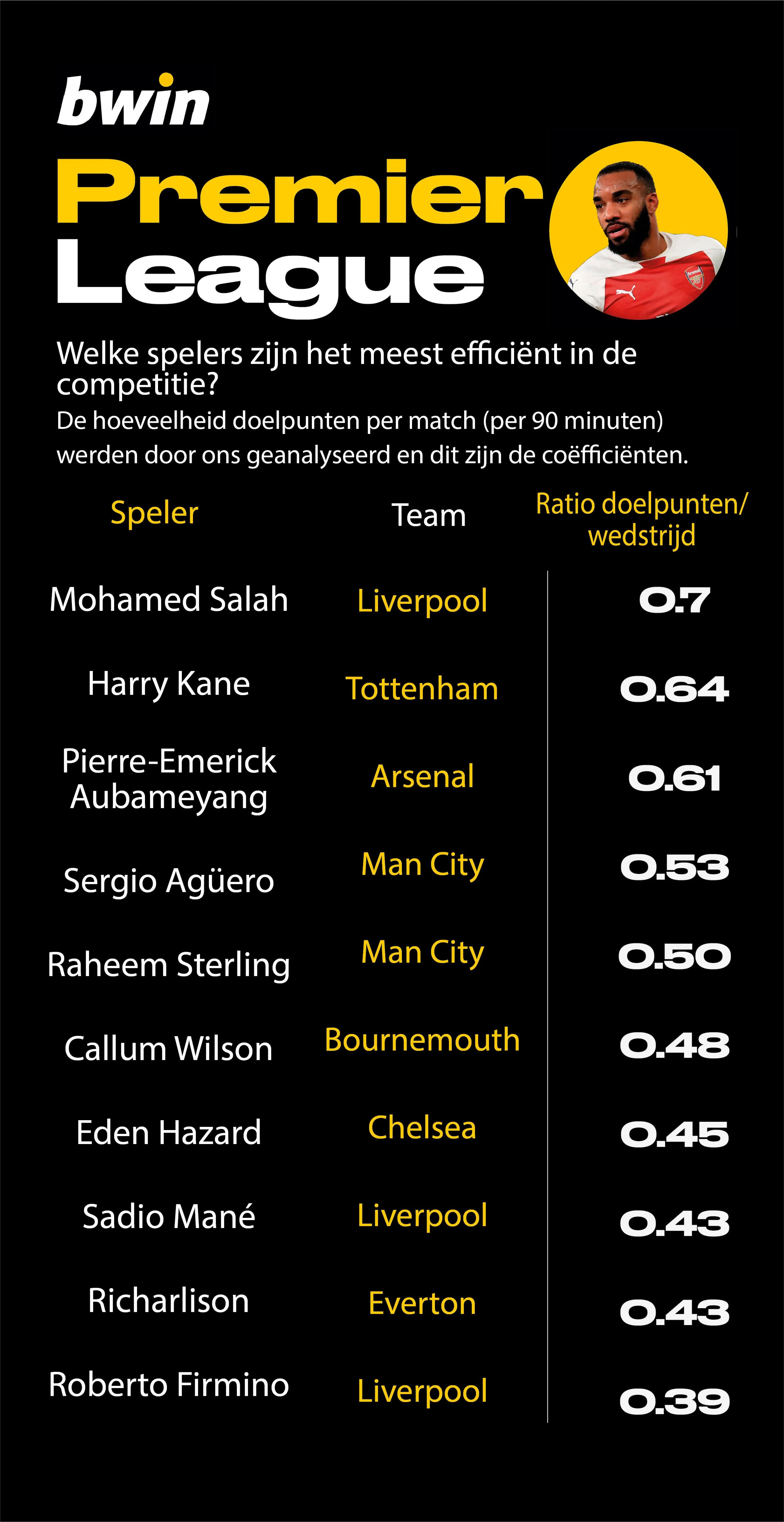 In de Premier League is de speler die het meest heeft gescoord ook de speler die het vaakst scoorde wanneer hij op het veld stond. Het gaat natuurlijk om de aanvaller van Liverpool Mohamed Salah. Zijn aanvalspartners bij de Reds, Sadio Mané en Roberto Firmino, zijn respectievelijk 8ste en 10de in deze ranking.