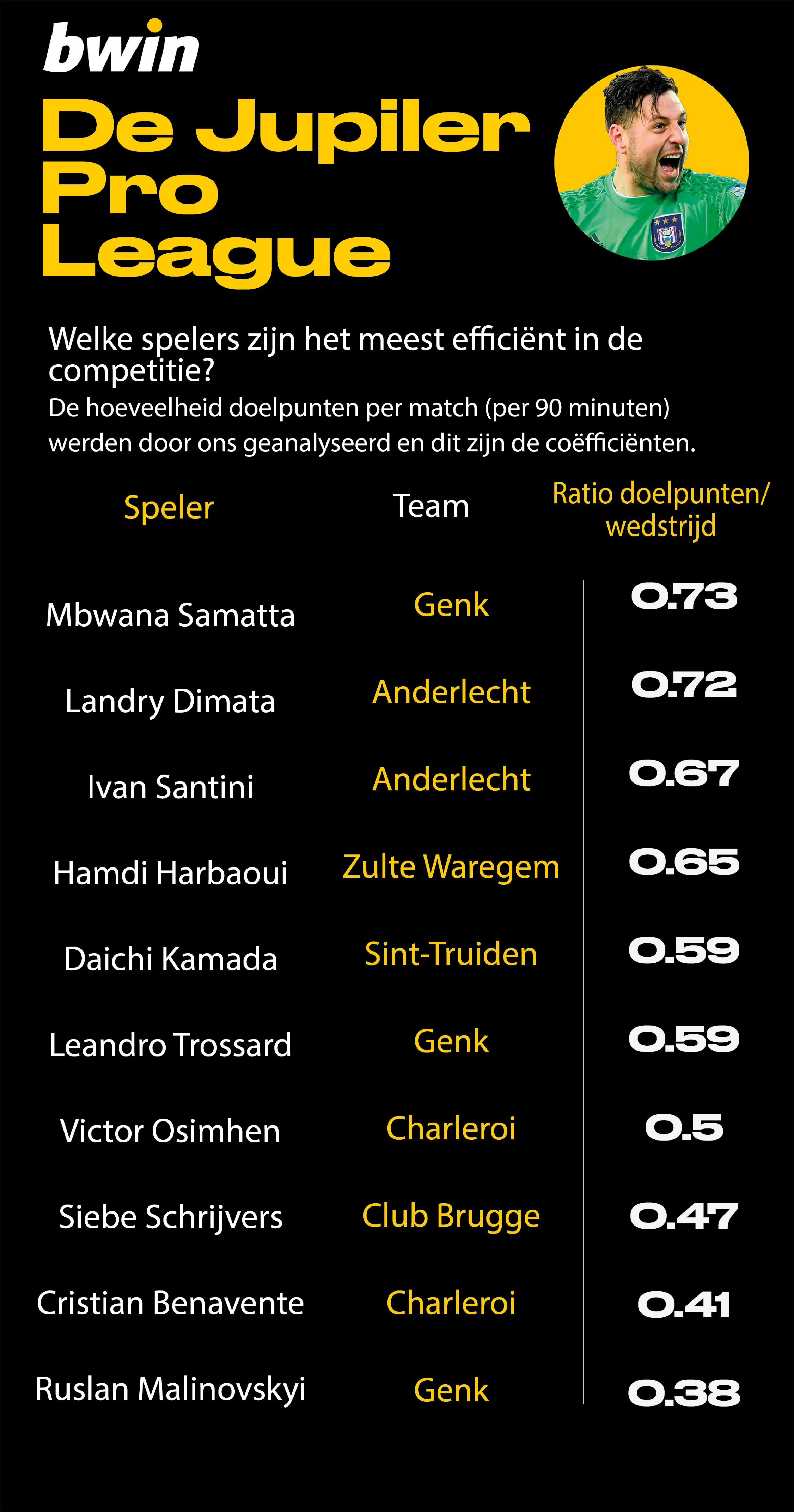 Merk op dat er slechts één speler is van de regerende kampioen en tweede ploeg in de stand, Club Brugge : Siebe Schrijvers (9de met 0.47 goals/match).